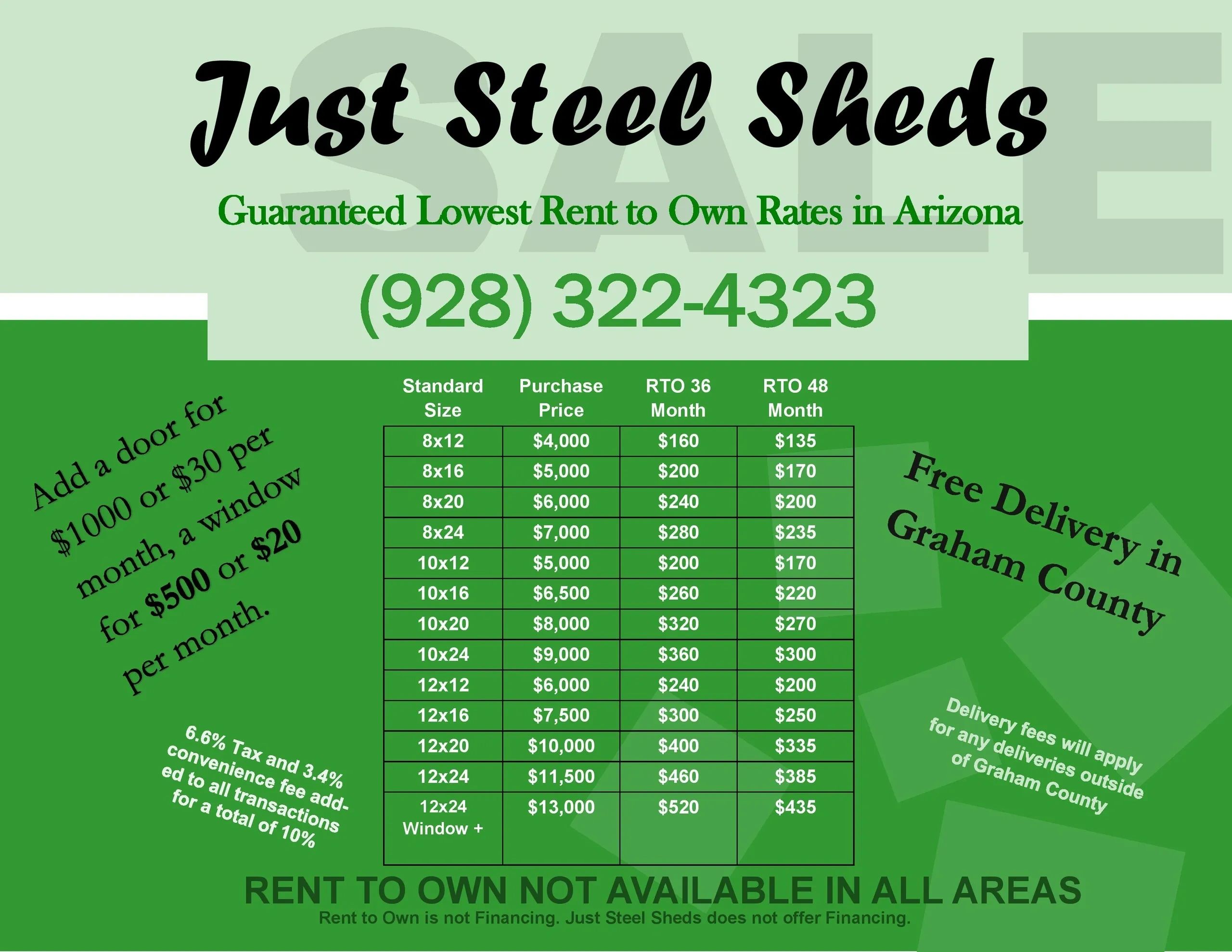 Just Steel Sheds are delivered fully assembled. Manufacured in Thatcher, Arizona. The set up is FREE! Also free local delivery in Safford, Thatcher. Every part of these sheds is built out of the finest steel around, to the highest quality. It will fit most side by sides.